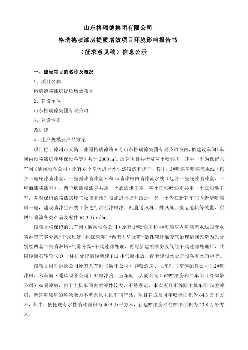格瑞德喷漆房提质增效项目 环境影响报告书 (征求意见稿)信息公示