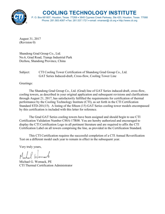 格瑞德冷却塔公司拥有国家级冷却塔性能检测基地,并且入围中核集团合格供应商。玻璃钢横流冷却塔(GAT系列)产品均通过了国家级权威检测机构的检测,其中冷却塔的热力性能、漂水率、耗电比、噪音等关键技术指标处于国际先进水平,取得了美国CTI认证、中国节水产品认证、中国节能产品认证、中国冷协CCTI认证。