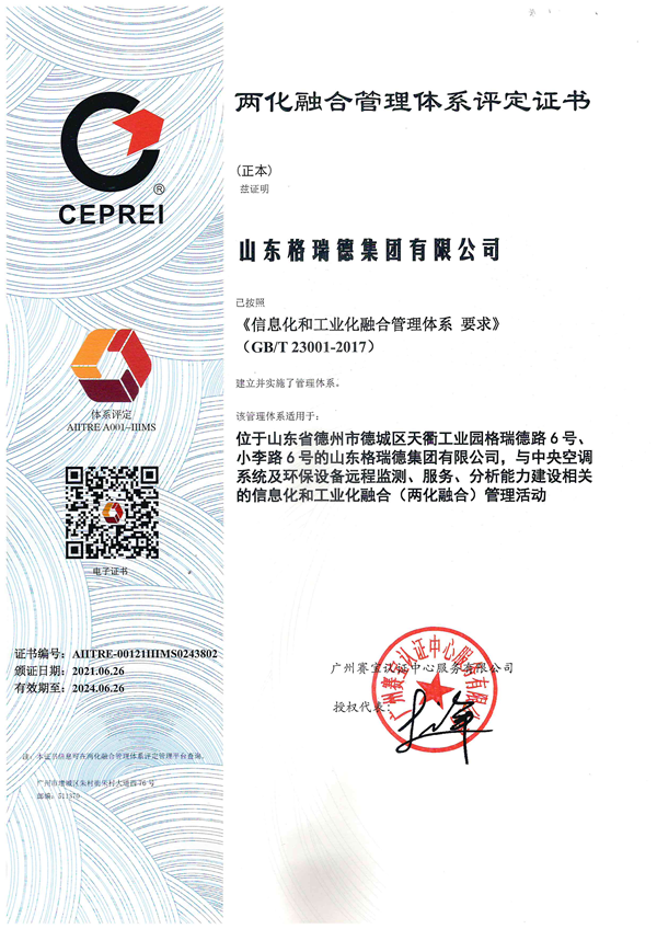 格瑞德集团自2017年起,积极开展两化融合贯标工作,加大力度投入信息化建设,推动集团业务发展。2018年第一次完成两化融合管理体系认证工作,依托商务运营平台、U9ERP系统以“供产销财务一体化管控能力”获得第一次认证证书,成为德州市前三家获得此认证的企业。2021年,集团迎来体系换证工作,再次依托应用物联网技术的中央空调系统运行智能监测控制平台、环保系统运行智能监测控制平台,以“中央空调系统及环保设备远程监测、服务、分析能力”顺利获得认证证书。
