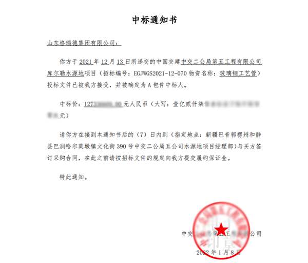 近日,格瑞德集团成功中标中交二公局库尔勒第二水源地项目,中标金额近1.3亿元。该项目为格瑞德集团2022年业务开展奠定了良好的基础,注入了强有力的动力。