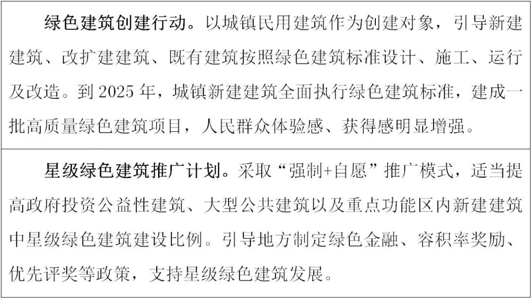 1.加强高品质绿色建筑建设。推进绿色建筑标准实施,加强规划、设计、施工和运行管理。倡导建筑绿色低碳设计理念,充分利用自然通风、天然采光等,降低住宅用能强度,提高住宅健康性能。推动有条件地区政府投资公益性建筑、大型公共建筑等新建建筑全部建成星级绿色建筑。引导地方制定支持政策,推动绿色建筑规模化发展,鼓励建设高星级绿色建筑。降低工程质量通病发生率,提高绿色建筑工程质量。开展绿色农房建设试点。