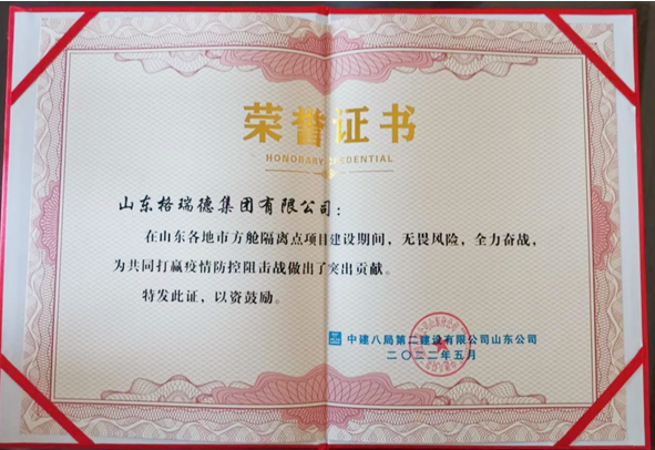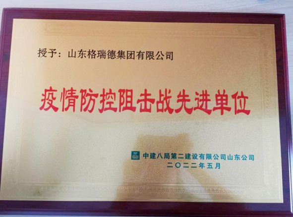 格瑞德集团临危受命,先后承揽临沂市罗庄区、莒南县、河东区隔离病房通风及过滤设备生产任务,由格瑞德集团生产的183台高效低噪音斜流风机、2台防爆斜流风机、144台净化空调器仅用5天时间完成生产工作。格瑞德集团高效、高速、高质量的技术品质荣获甲方客户授予疫情防控阻击战先进单位称号。
