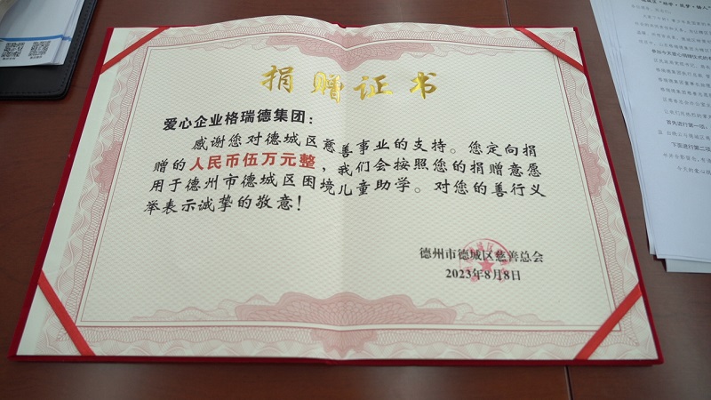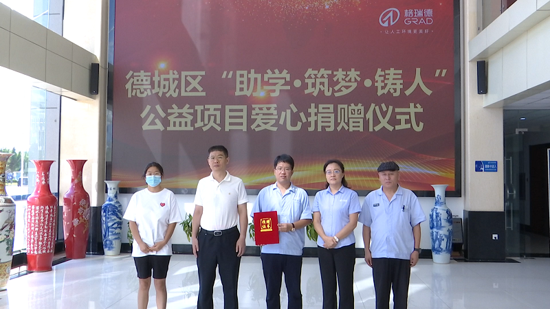 为帮助更多困境学子点亮求学梦,格瑞德积极参与德城区“助学·筑梦·铸人”公益项目,并捐赠5万元。