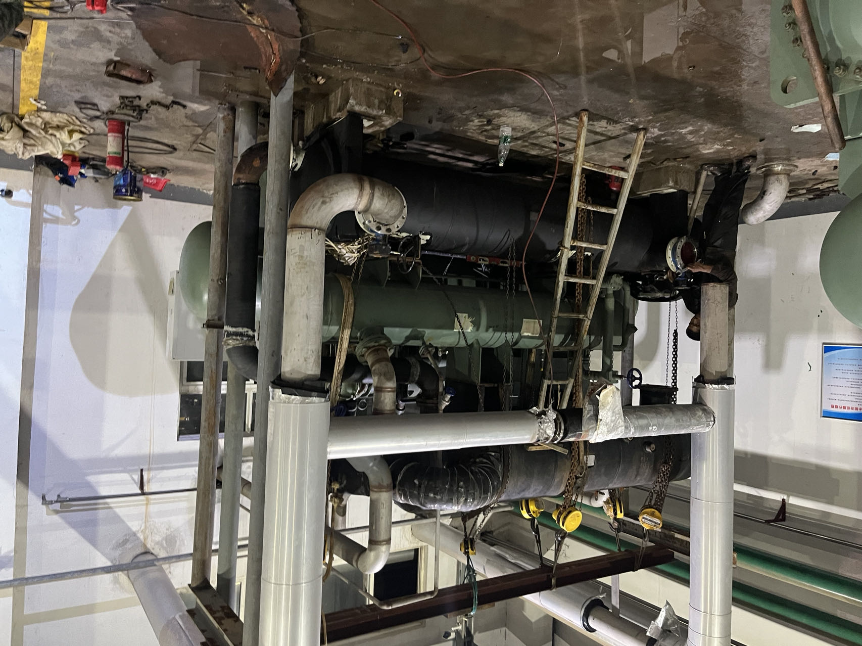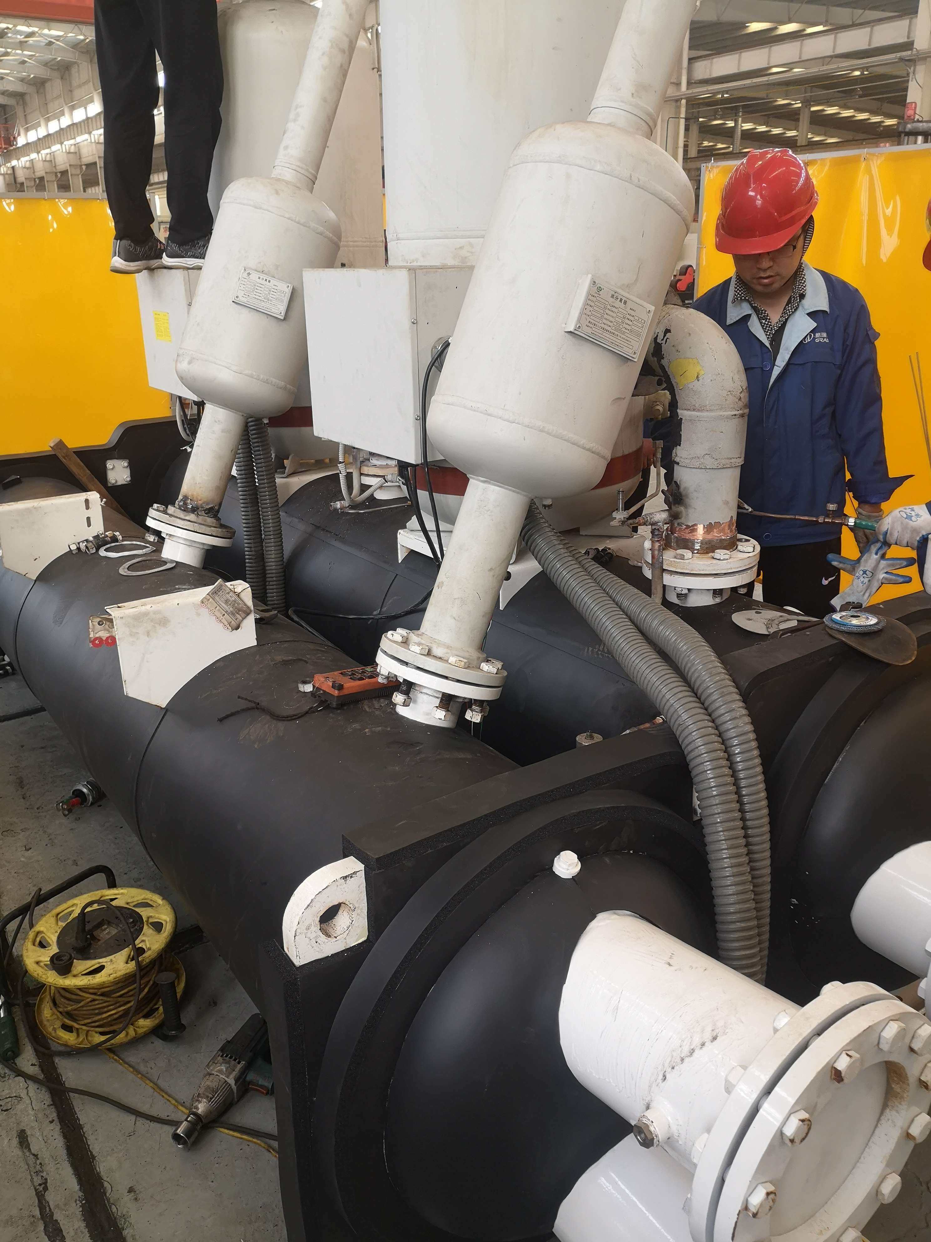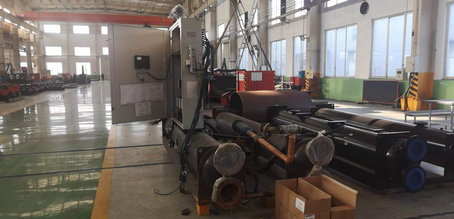 现场使用的是江苏希赫尔的双螺杆工业冷水机组(蒸发冷)机组,由于换热器损坏影响了正常运行。格瑞德公司为其定做了一台新的蒸发器,安装尺寸完全一致。新蒸发器的安装使得机组能够重新正常运行,保障了浙江利安隆新材料生产过程中的温度控制需求。