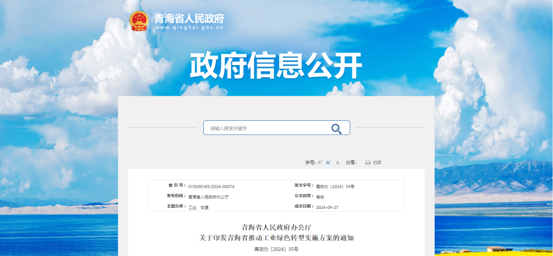 近日,青海省人民政府办公厅印发青海省推动工业绿色转型实施方案的通知。