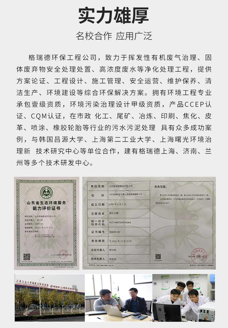 格瑞德集团致力于挥发性有机废气治理、固体废弃物安全处理处置、高浓度废水等净化处理工程,提供方案论证、工程设计、施工管理、安全运营、维护保养、清洁生产、环境建设等综合环保解决方案。