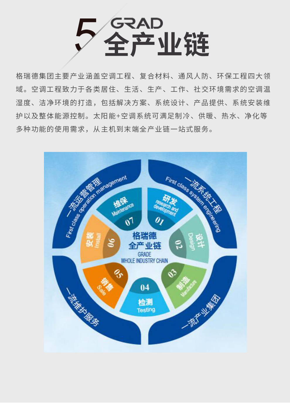 格瑞德致力于让人工环境更美好,通过打造空调工程、通风人防、复合材料、环保工程领域的全过程解决方案来满足客户需求,格瑞德构建了包括品牌规划、系统设计、技术开发、产品制造、整体施工、维护服务、检测认证、人才交流、产业集群的全生命周期产业链和产业生态。