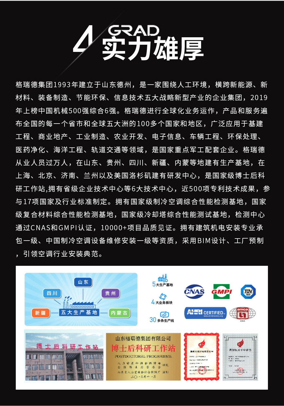 格瑞德1993年建立于山东德州,目前是一家围绕人工环境,横跨新能源、新材料、装备制造、节能环保、信息技术五大战略新型产业的企业集团。格瑞德进行全球化业务运作,产品和服务遍布全国的每一个省市和全球五大洲的100多个国家和地区,广泛应用于基建工程、商业地产、工业制造、农业开发、电子信息、车辆工程、环保处理、医药净化、海洋工程、轨道交通等领域。格瑞德从业人员过万人,在山东、贵州、四川、新疆、内蒙等地建有生产基地,在上海、北京、济南、兰州以及美国洛杉矶建有研发中心。