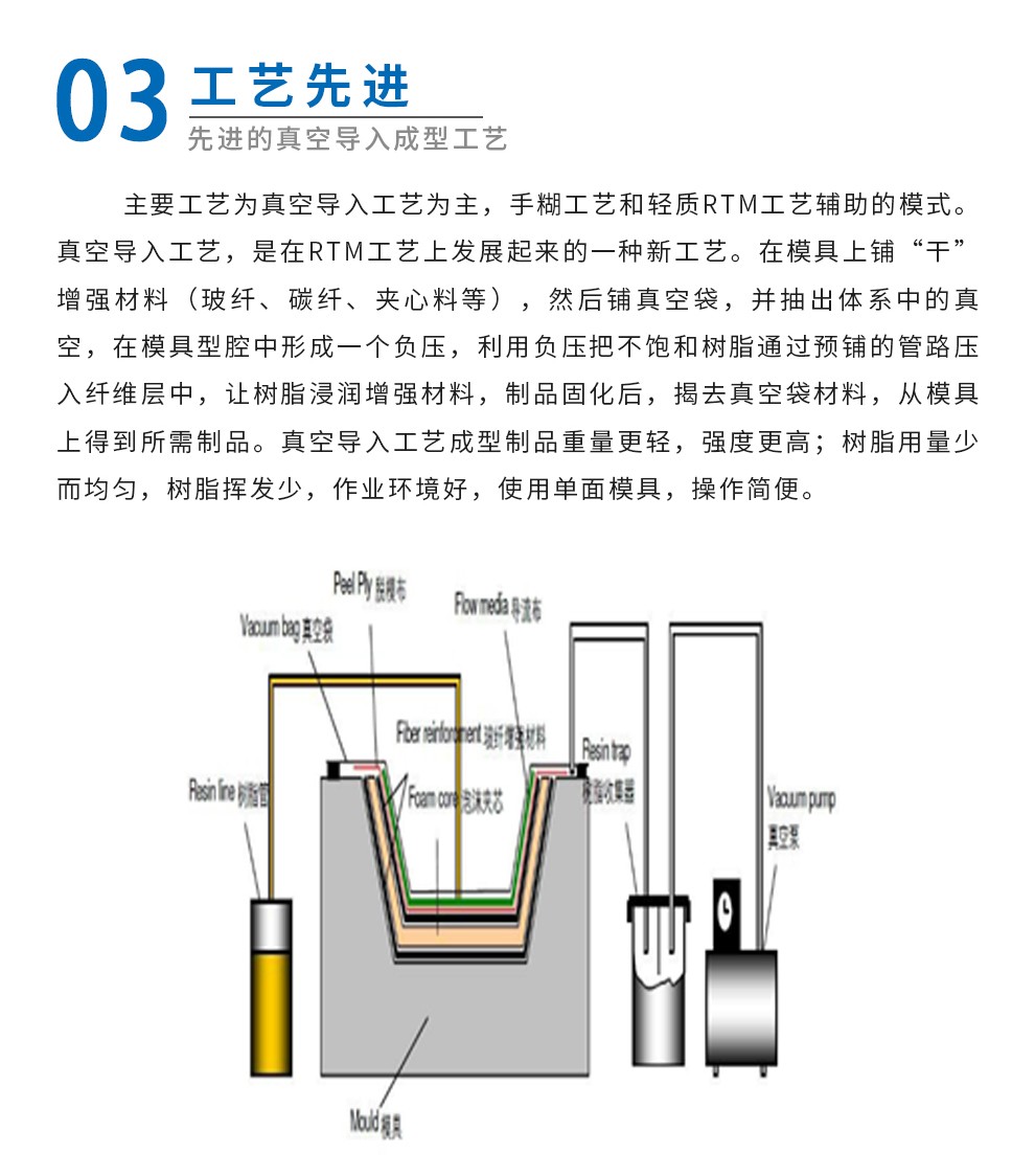 涵盖真空导入、热塑、模压、缠绕、手糊等各大工艺,广泛应用于航空航天、风力发电、新能源汽车、市政、水利、石化、体育器材等各产业。